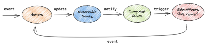 공식 문서에서 가져온 MobX 흐름이다. 어떤 action이 실행되면, 관찰할 수 있는 상태 값이 업데이트된다. 그 후에 이 값을 바라보고 있는 z컴포넌트에 알림(notify)이 가고, 렌더링한다. redux와 다르게 Mobx는 action이 직접 state 업데이트 한다. reducer에 대한 정의가 줄어들었단 소리다.