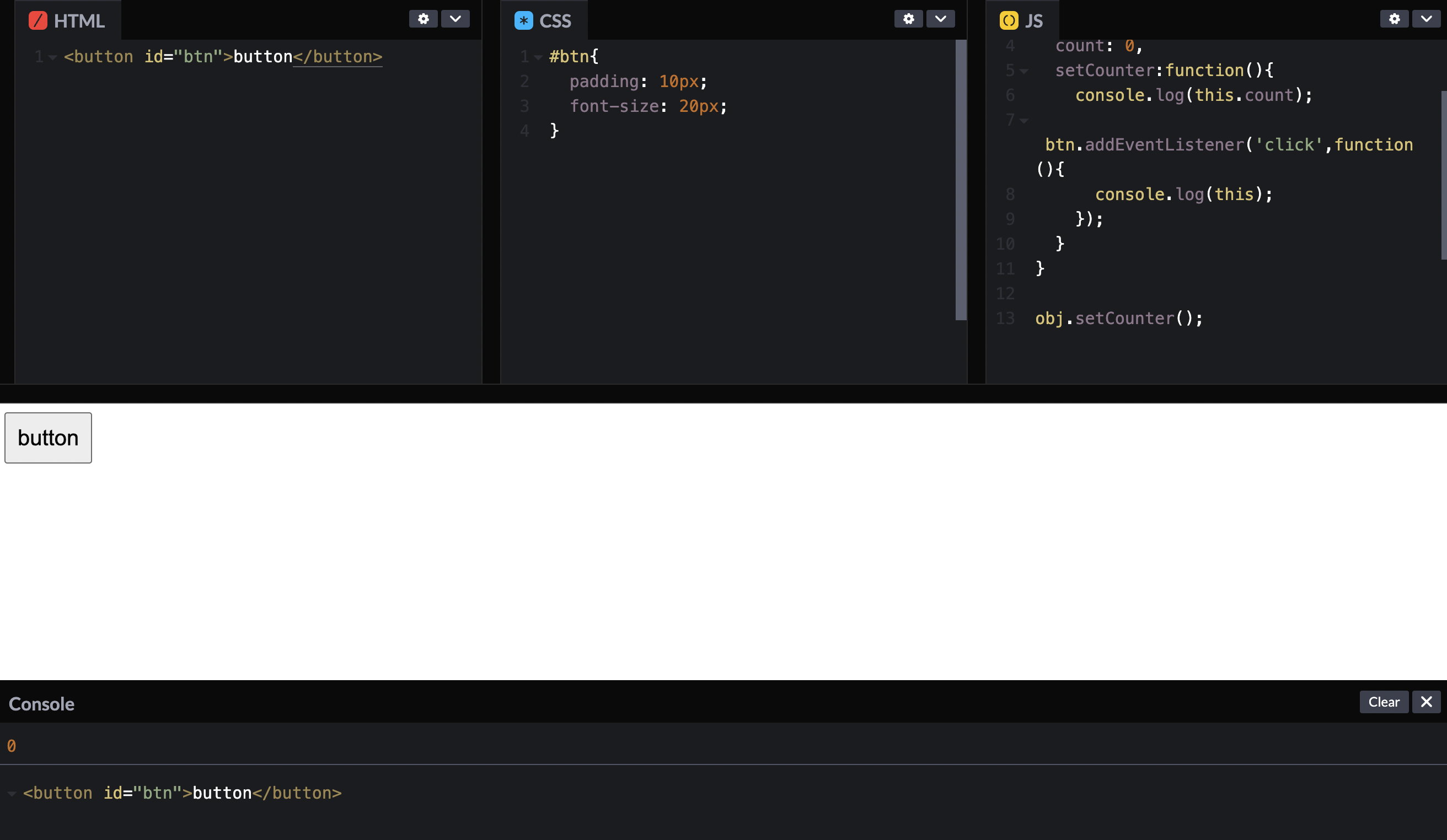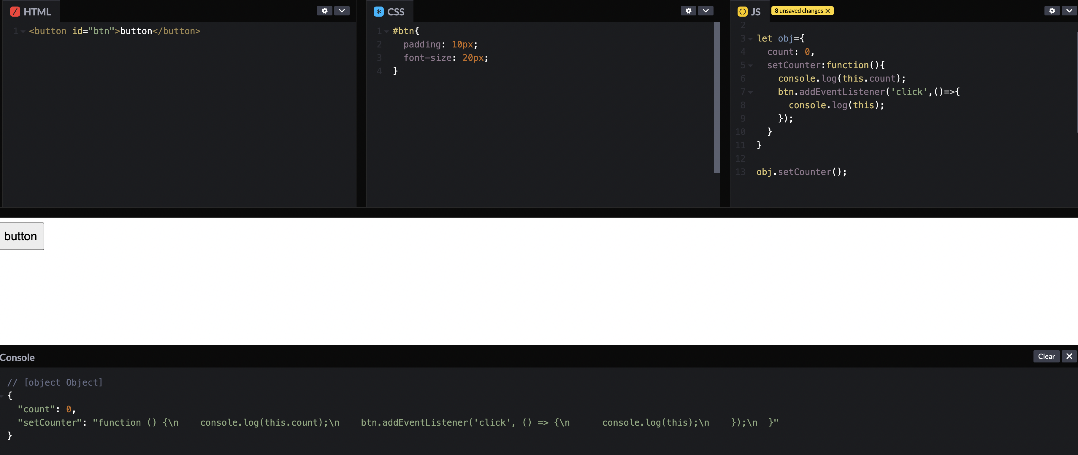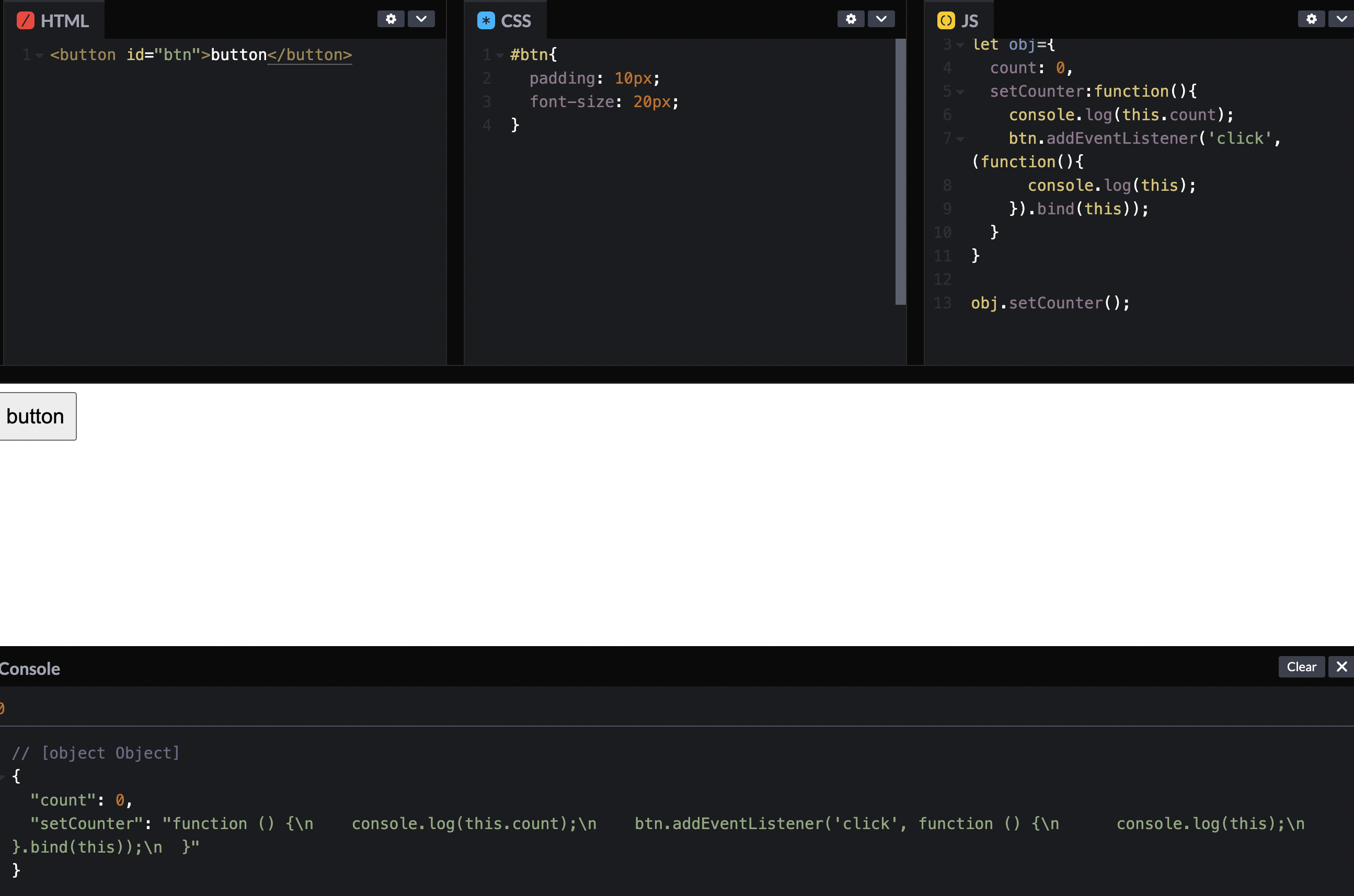 객체 안에 counter와 setCounter 함수를 만들어 넣었다. setCounter 함수는 표현식으로 작성했다. 함수 안에는 this.counter를 출력하고, button을 누르면 this를 출력하게 했다.