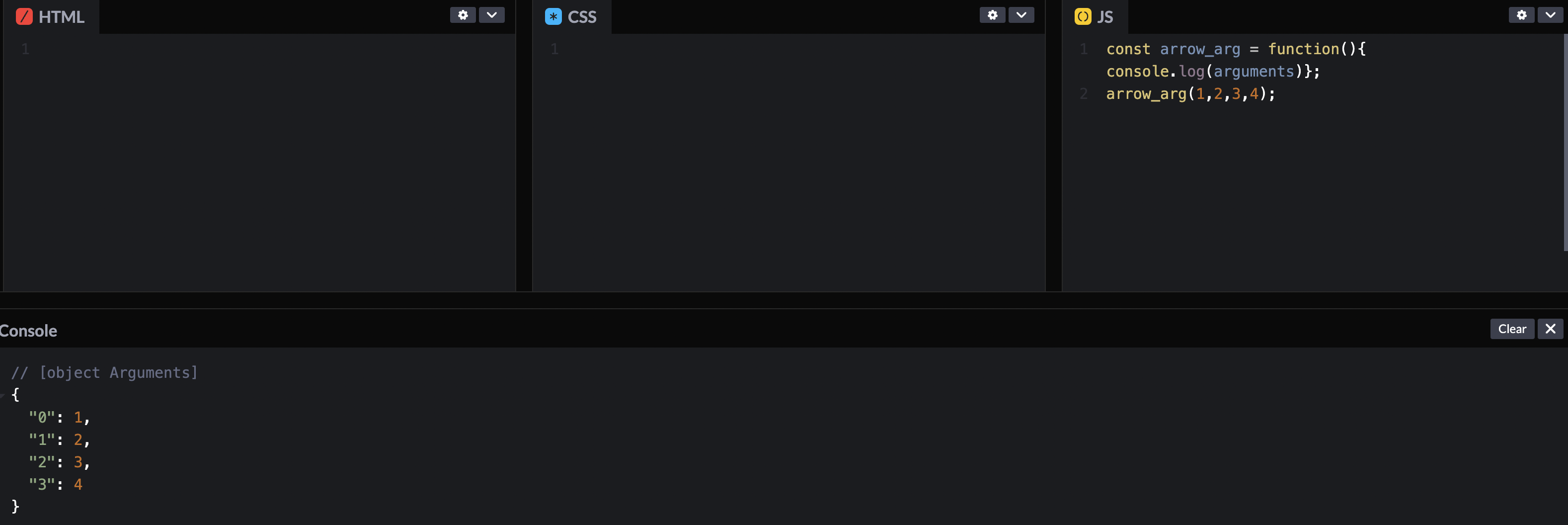 화살표 함수에는 없는 게 하나 더 있다. 바로 arguments. 함수 선언식이나 표현식을 사용할 경우 함수에서 매개 변수를 특별히 지정하지 않아도 arguments를 통해 유사배열로 매개 변수에 접근할 수 있는데 반해 화살표 함수는 arguments가 없다(https://codepen.io/idealstring/pen/eYMPzJO).
