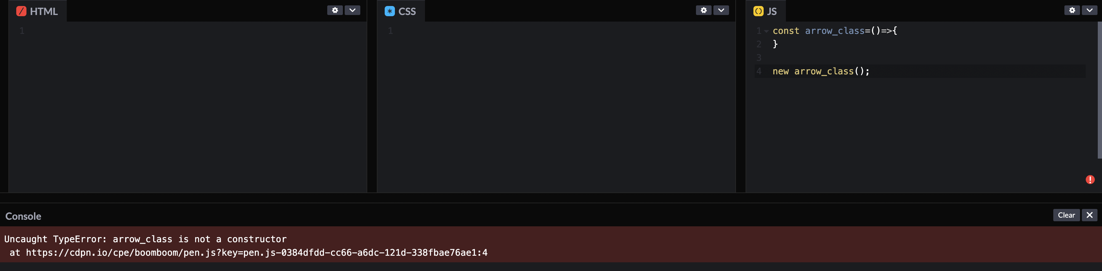 화살표 함수를 쓴 결과다. 별다른 바인딩 처리하지 않았음에도 상위 스코프에 있는 counter을 this로 인식했다. 화살표 함수에는 this가 없음을 확인할 수 있다. 더불어 this가 없기에 class 생성자 함수로 쓸 수 없다(https://codepen.io/idealstring/pen/gOeBrNX).