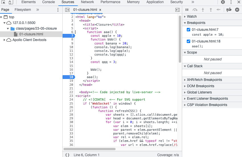 위 코드를 실행시키고 개발자도구 소스로 가서 해당 코드 진행 사항을 차근차근히 살펴볼 수 있다. 무엇보다 오른쪽 스코프탭을 통해 클로저 상태도 알 수 있다.