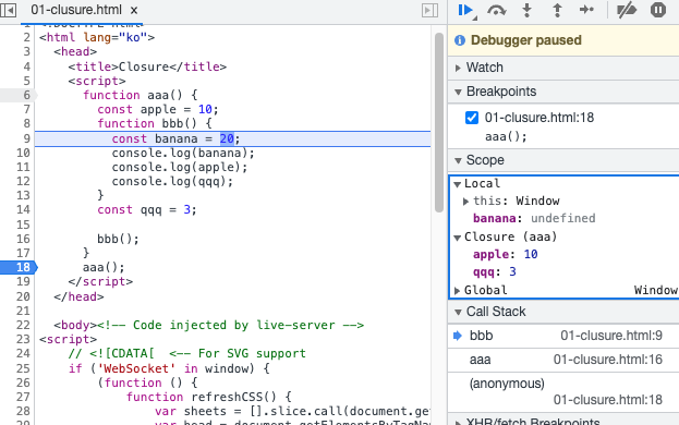 위 코드를 순차로 따라가보자. 처음 페이지를 로드하며 script파일을 읽는다. aaa()를 만나 함수 실행. const apple = 10; 실행, const qqq = 3; 실행. bbb()를 만나 함수 실행. bbb() 안에 들어가서 const bababa = 20;을 실행. 여기까지가 위 스크린샷 상태다. 오른쪽에서 보면 스코프 탭 안에 closure가 있음을 볼 수 있다. closure로 aaa를 가지고 있다. 측 bbb는 aaa를 상위 스코프로 인정하고 있는 상태를 말한다. 클로저 탭 안에 있는 변수를 살펴보자. bbb()함수는 aaa() 상위 함수에 있는 apple과 qqq를 모두 참조할 수 있다고 뜬다. 따라서 그 다음 콘솔들으 모두 실행하면 20, 10, 3이 모두 찍힌다.