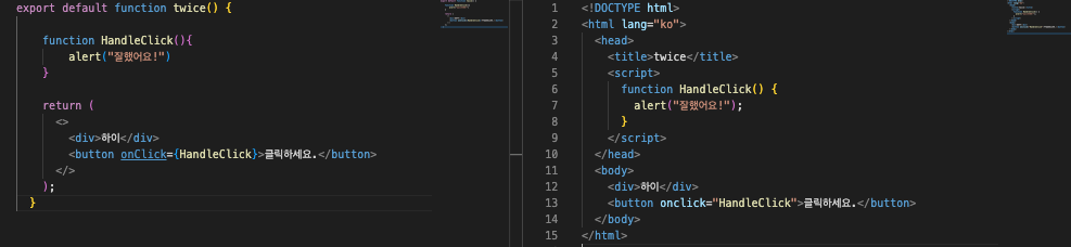 onclick 이벤트가 발생하는 버튼을 보자. HTML은 onclick 다음 태그처럼 큰따옴표로 함수를 실행시킨다. 반면, JSX는 중괄호를 사용한다.