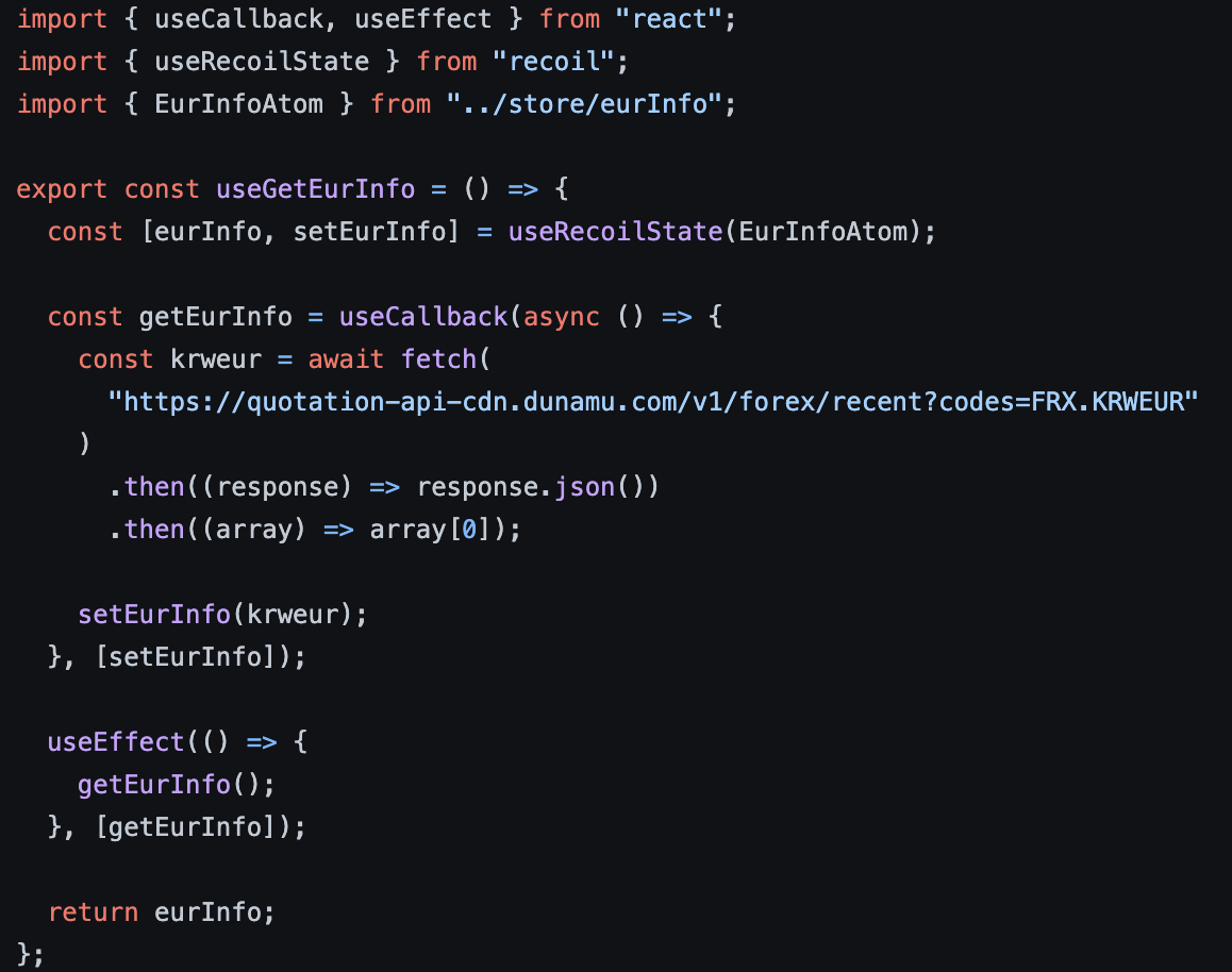 위 사진처럼 커스텀 훅울 호출했는데 eurInfo가 무한 반복 중이었다. 즉, 계속 리렌더링이 일어나고 있었다. (콘솔로 출력하면 스크롤바가 끊임없이 늘어나는 게 아주 인상적이다.)