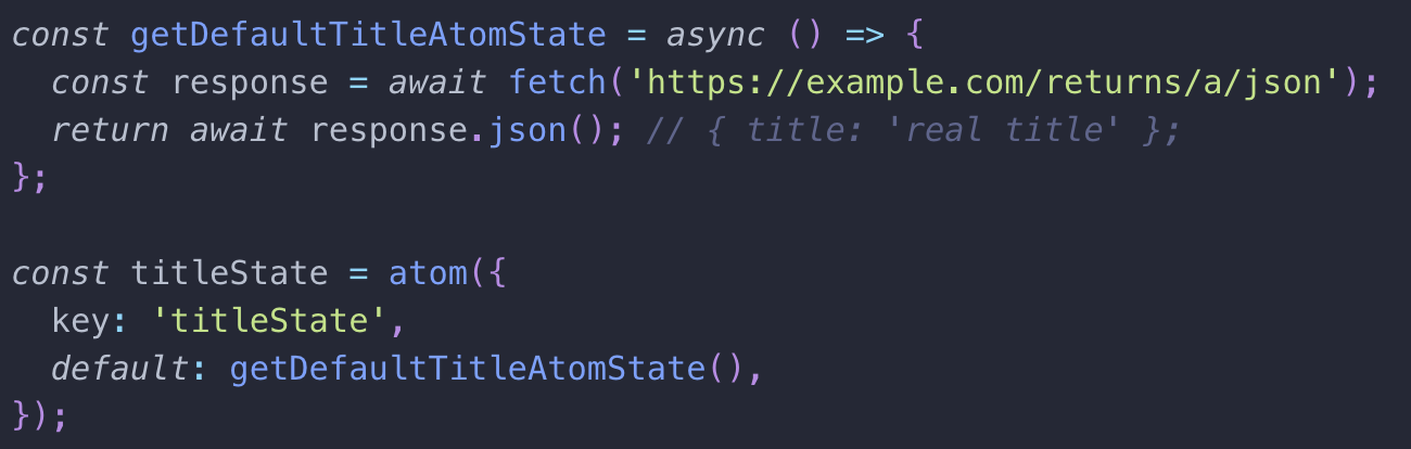 MVVM 패턴에서 model 역할인 이 파일은 API 값을 전역 상태에서 보관하고, selector를 통해 특정 함수를 불러 동작하도록 만들었다. 위 캡처 코드와 위 코드를 비교하면서 봐도 얘를 model로 써야 할 이유가 보이지 않았다. seletor 부분도 viewModel 쪽에서 일반 함수로 써도 무방 할 테니까. MVVM 패턴을 유지하고, 리렌더링을 막고 싶은 방법을 여러 검색으로 찾았으나 알맞은 방법이 없었다. 그러다 우연히 jest 관련 사항을 공부하다가 recoil 공식 문서에 있는 한 코드에서 힌트를 얻었다.