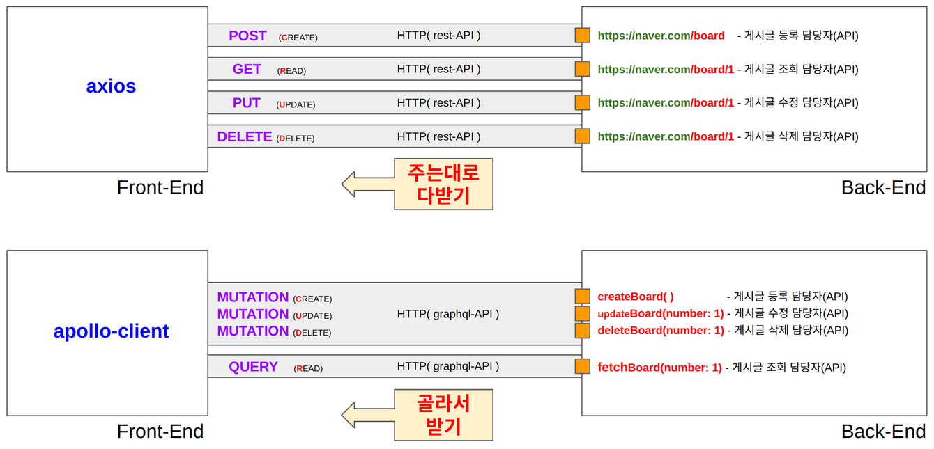 GraphQl-API는 REST-API와 마찬가지로 HTTP 요청으로 서버에 접근한다. 위에서 언급한 바 메소드가 쿼리와 변형 뿐이다. REST-API와 비교 시 QUERY는 GET, MUTATION은 POST, PUT, DELETE와 같다.