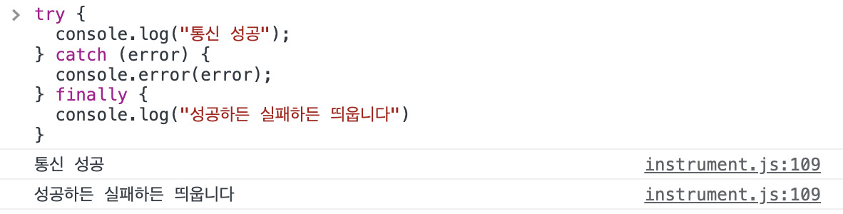 try 실행 시 중간에 오류가 발생한다면 catch가 그 즉시 실행된다 즉 위 코드에서 console.log("통신 성공2");에서 오류가 났다면 console.log("통신 성공3");은 실행하지 않고 바로 catch로 넘어간다.